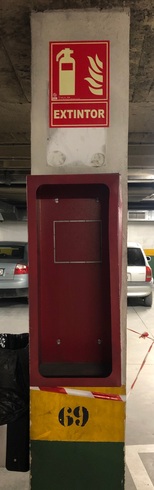 In the underground car park in Priego de Córdoba. Behind the missing fire extinguisher is a missing notice.